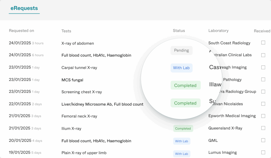 Easily monitor the status of both pathology and radiology requests throughout the entire process, from initial request through to completion.